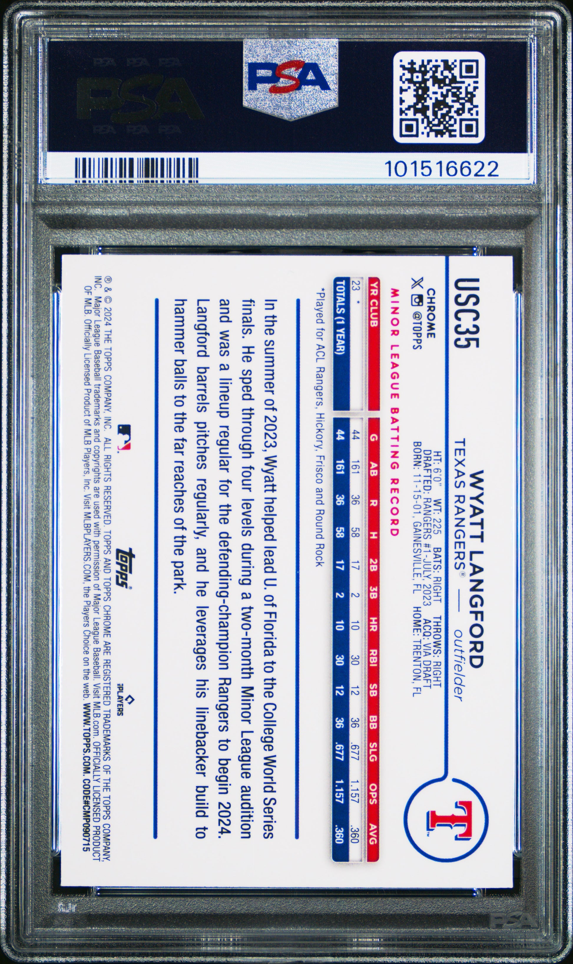 2024 Topps Chrome Update Wyatt Langford #USC35 Aqua Refractor /199 PSA 9